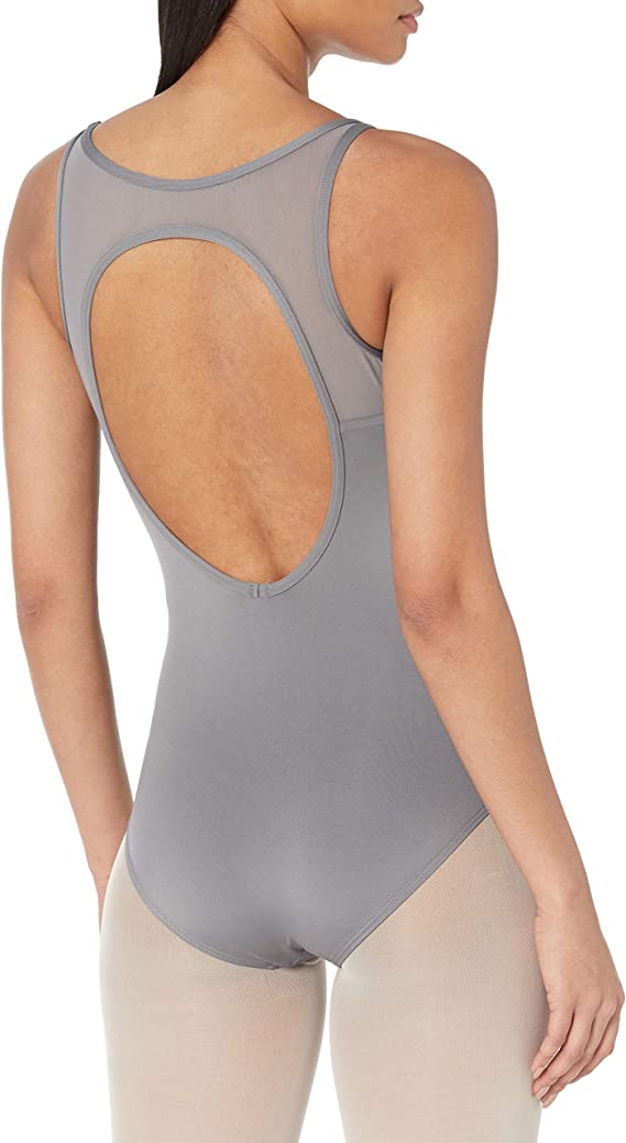 Deze leotard is afgewerkt met grijs mesh en heeft een mooie open rug.