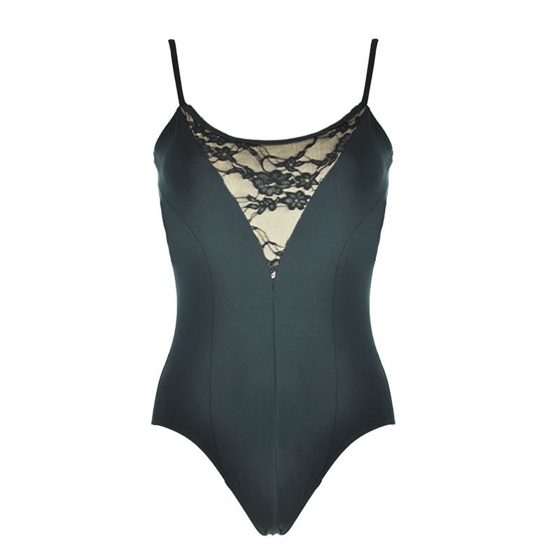 Elegante leotard van Capezio met mooie huidkleurige V aan de voorzijde afgewerkt met kant.