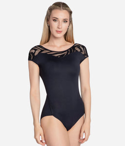 Deze leotard is afgewekt met een kapmouwtje en mesh details wat lijkt op zebra print.